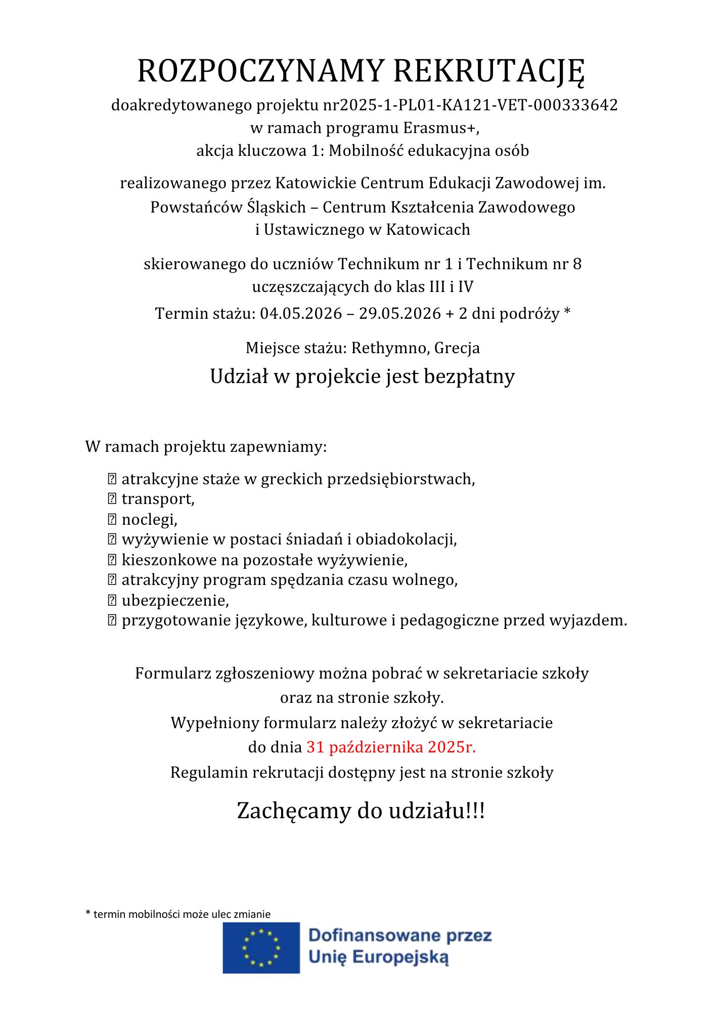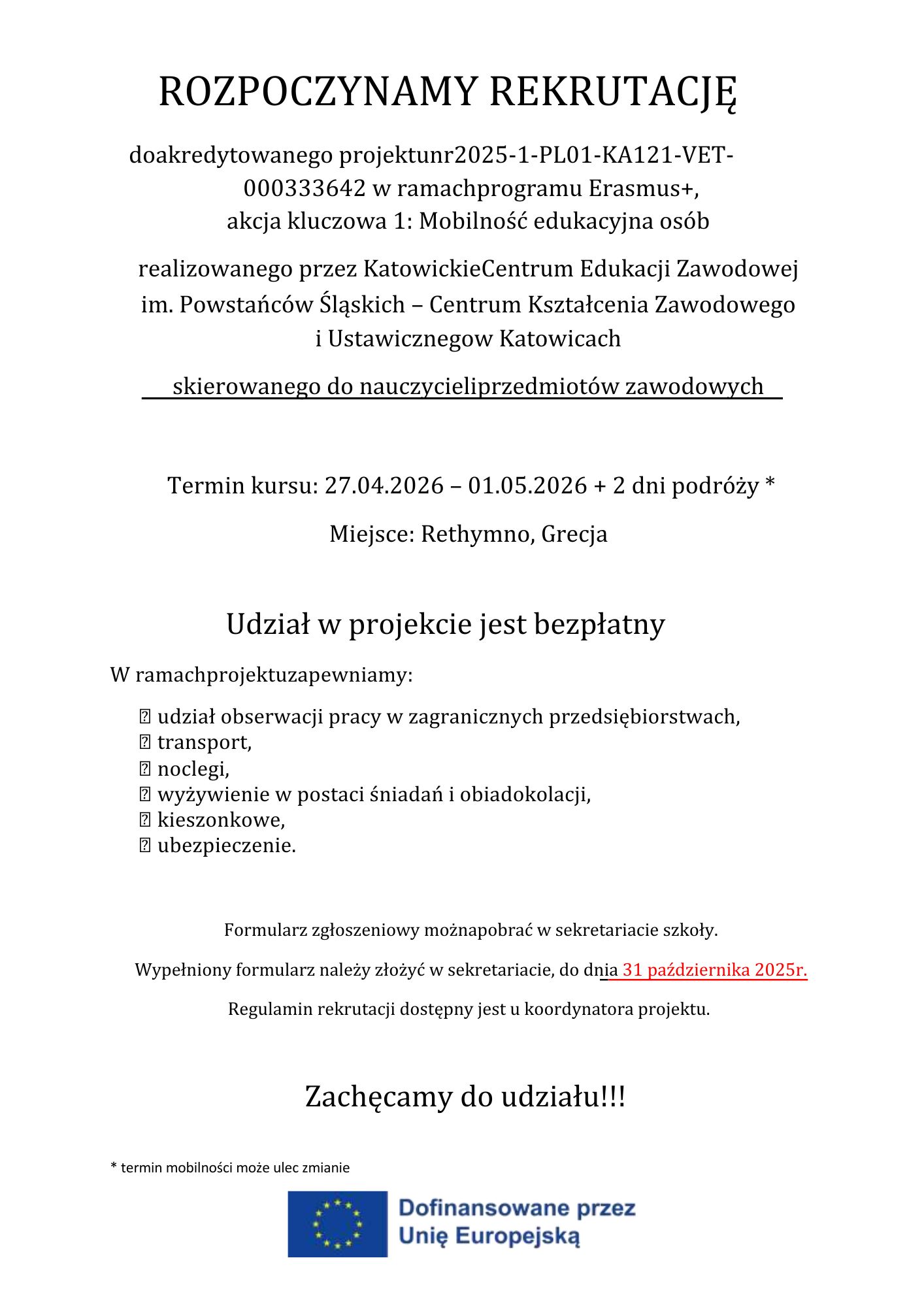 W ramach projektu na praktyki zawodowe do Rethymno na Krecie wyjedzie w maju’2026 łącznie 27 uczniów KCEZ-CKZIU klas 3 i 4 oraz na obserwację pracy – 4 nauczycieli zawodowców.