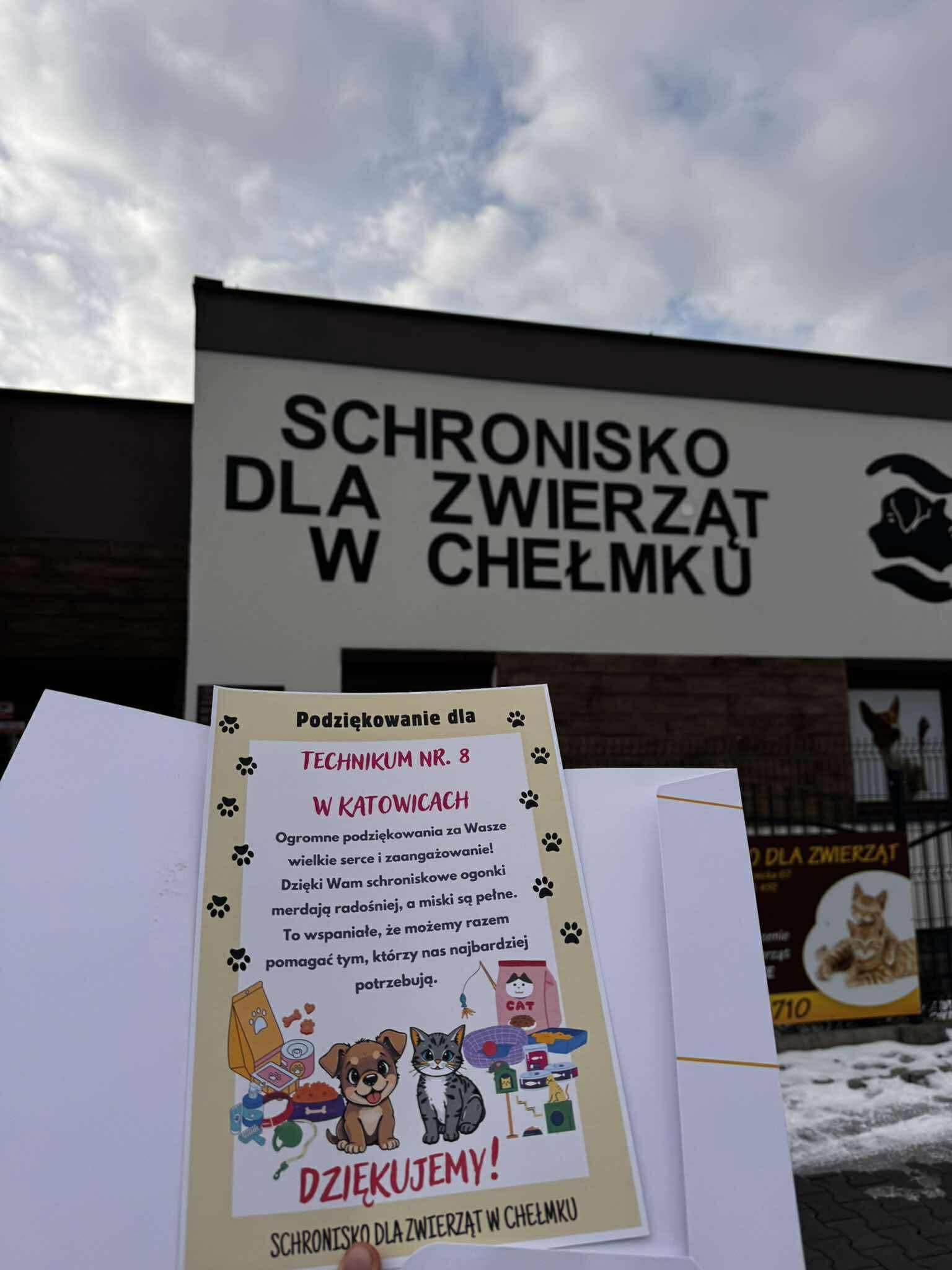 Dziś przedstawiciele Samorządu Uczniowskiego – Filip i Igor – przekazali do Schroniska dla Zwierząt w Chełmku karmę oraz środki czystości zakupione z funduszy zebranych podczas świątecznego kiermaszu szkolnego.